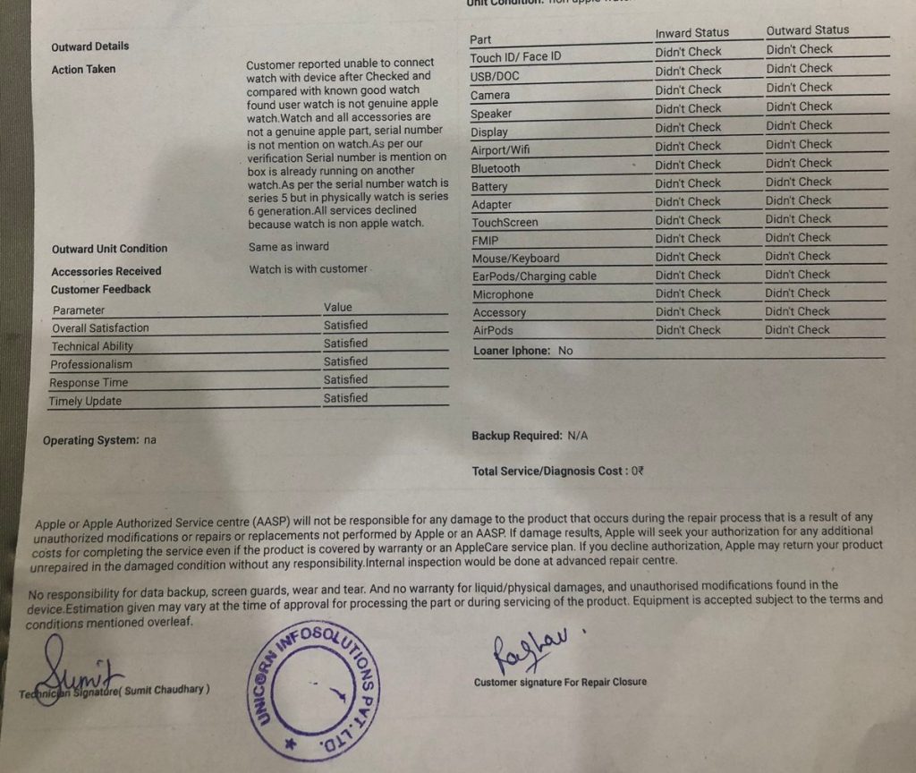 Also, in the Settings > About, we can see that the Device Name says watch6. Well, Apple has not even released their Watch Series 6 and looks like it already has a clone which is delivered to Raghav. As an intelligent customer, Raghav decided to reach out to the Apple Authorised Service Provider – Unicorn which is situated at C-39, Lower Ground Floor Plot no M-03, Sector -18 DLF Mall of, Noida, Uttar Pradesh. There, he showed the product he received to confirm that it’s Fake. And dang! They confirmed that the Watch Delivered by Flipkart to this consumer is a Fake one. Here is a report which Raghav received from the Apple Authorised Service Provider.